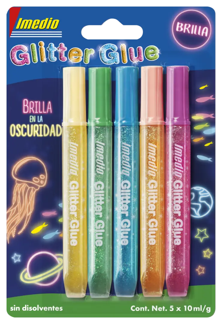 Girar el tapón de color para quitarlo. Presionar ligeramente el tubo para aplicar el pegamento. Volver a colocar el tapón después de su uso. En función de la cantidad utilizada, IMEDIO Glitter Glue se seca al tacto una vez transcurridos aproximadamente 60 minutos y se seca por completo después de aproximadamente 4 horas. IMEDIO Glitter Glue se disuelve al remojarlo en agua, esto significa que no soportará operaciones de lavado. Consejo práctico: la primera vez que utilice IMEDIO Glitter Glue, practique aplicándolo sobre un trozo de papel para aprender a utilizar el nuevo aplicador de precisión.